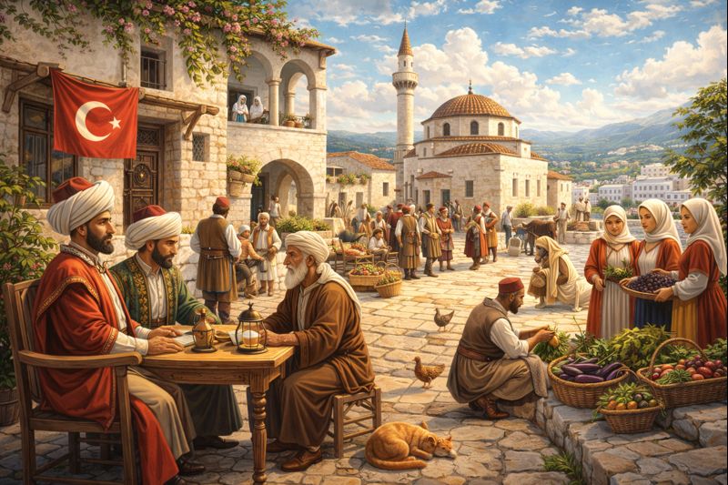 Transition to Ottoman rule, with local autonomy preserved and traditional village life maintained.